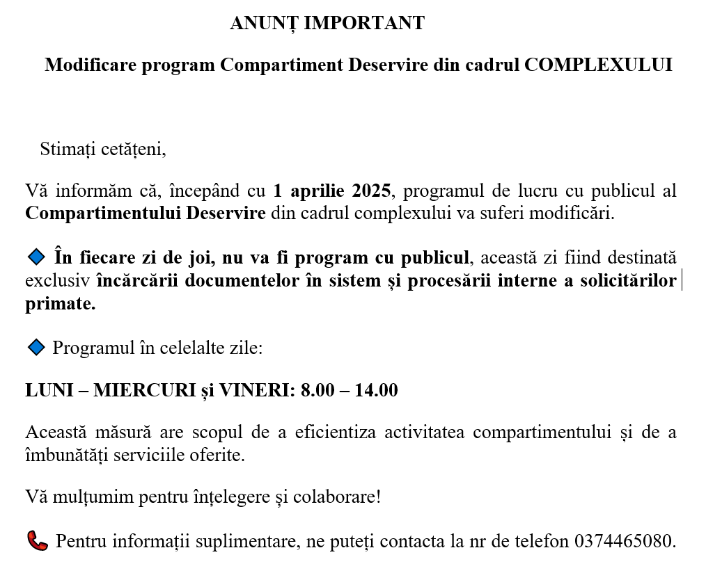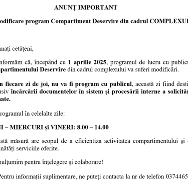 Modificare program Compartiment Deservire din cadrul COMPLEXULUI