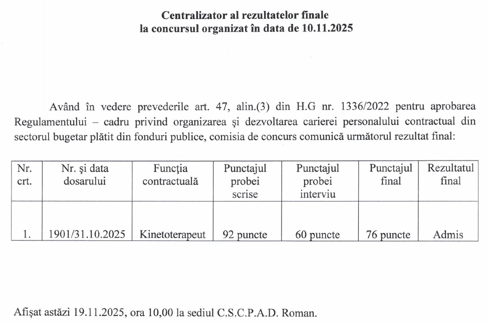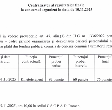 Rezultate finale la concursul organizat in data de 10.11.2025
