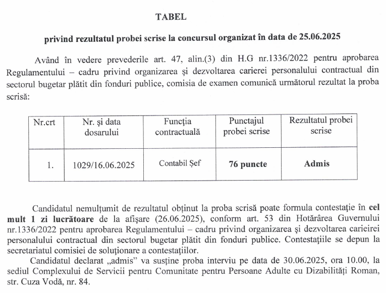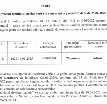 Rezultate la proba scrisă, contabil șef, la concursul organizat în data de 25.06.2025