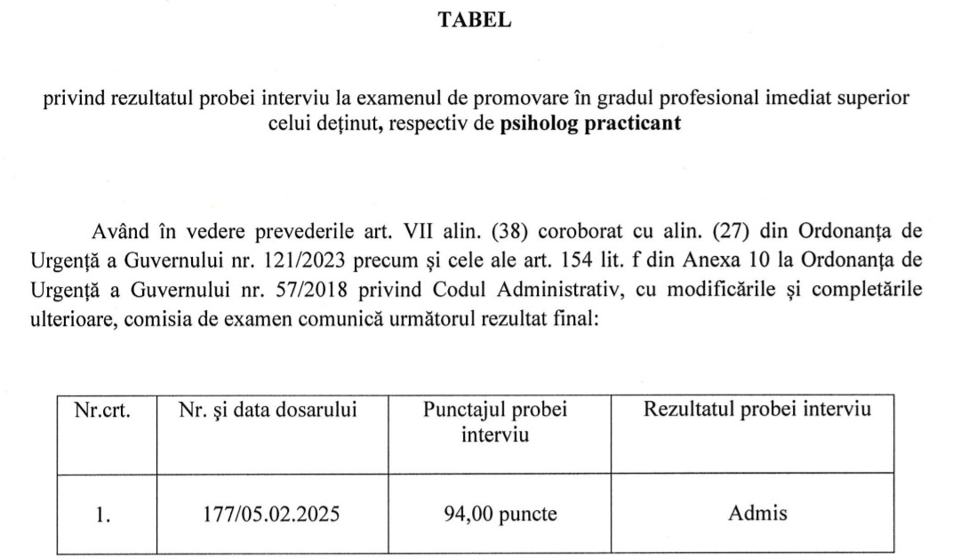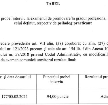 Rezultate Proba interviu la concursul de avansare in grad: psiholog practicant