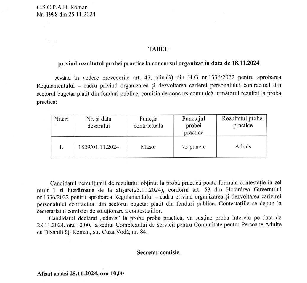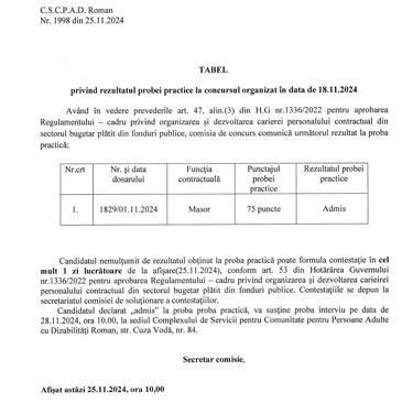 Rezultate Proba practica la concursul organizatin data de 18.11.2024