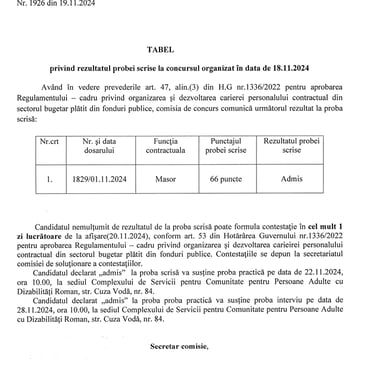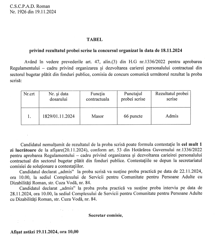 Rezultate Proba scrisa la concursul organizatin data de 18.11.2024