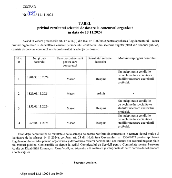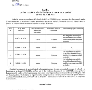 Rezultate selectie dosare la concursul organizat in data de 18.11.2024
