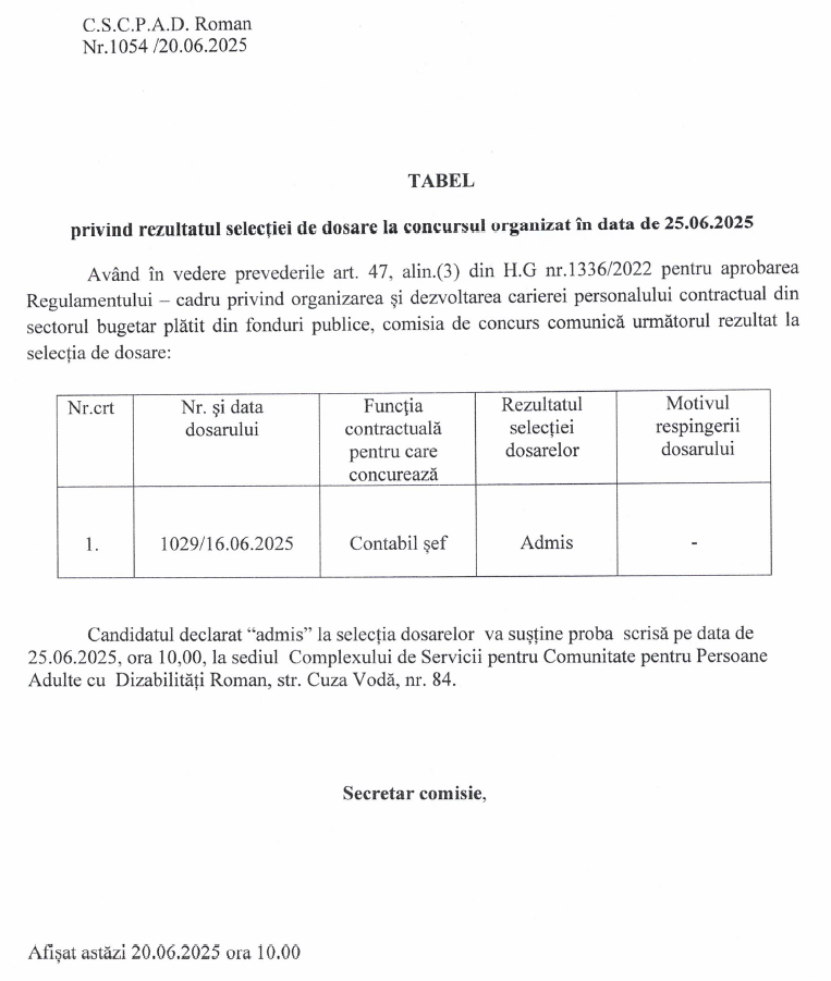 Rezultate selecție dosare la concursul organizat în data de 25.06.2025