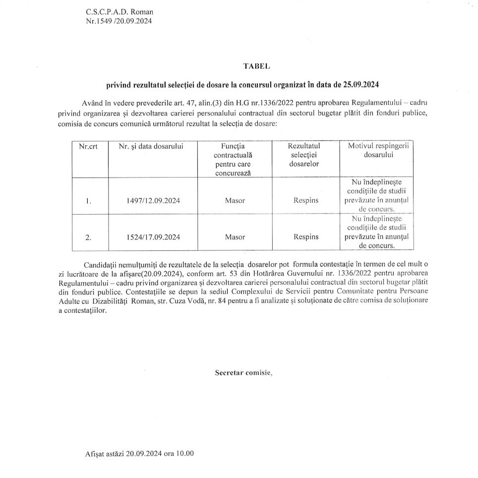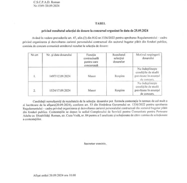 Rezultate selectie dosare la concursul organizat in data de 25.09.2024
